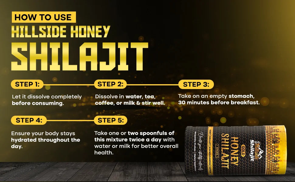 Scoop a small spoonful (pea-sized amount) of Honey Shilajit and dissolve it in warm water, tea, or milk, or consume it directly off the spoon. Take it once daily in the morning on an empty stomach for best results.